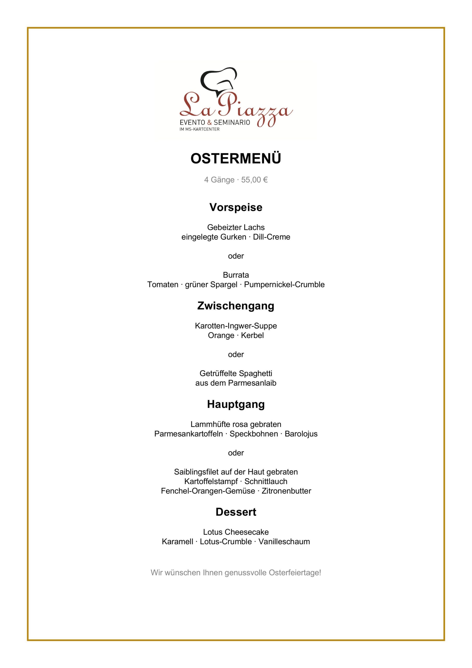 Wir freuen uns Ihnen unser Ostermenü hiermit anzukündigen. Dieses Jahr können Sie aus unserer Speisenkarte und unser Ostermenü wählen.